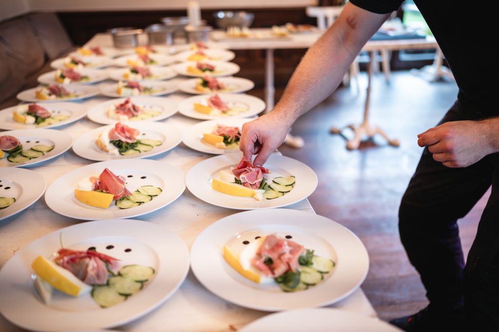 Ein serviertes Menü mit mehreren Gängen strahlt Eleganz aus und bringt Struktur in den Ablauf der Feier. Alle Gäste werden gleichzeitig bedient, die Teller sind liebevoll angerichtet, und die Atmosphäre wirkt sofort feierlicher. Damit jedoch alle auf ihre Kosten kommen, lohnt es sich, Varianten einzuplanen: klassisch mit Fleisch oder Fisch, vegetarisch oder vegan – und für Gäste mit Unverträglichkeiten auch individuelle Anpassungen. Genau hier liegt allerdings die Herausforderung: Viele Caterer arbeiten mit einer begrenzten Wahl von meist zwei bis drei Menüoptionen. Eine enge Abstimmung im Vorfeld ist daher entscheidend, damit die Vielfalt zur Hochzeitsgesellschaft passt und jeder unbeschwert genießen kann.